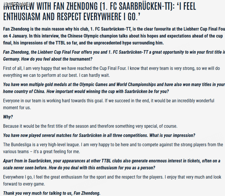 樊振东谈德甲联赛:水平非常高,能感受到人们对于选手的尊重