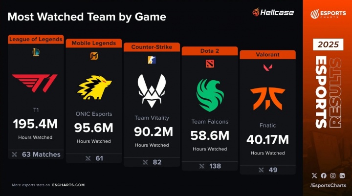 2025年观看量最高的电竞战队:英雄联盟T1断档第一
